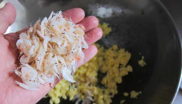 雞蛋需要打散瞭,不要加水和鹽。植物油熱瞭,直接就下鍋炒雞蛋和蝦皮,炒的雞蛋碎點更好包餃子。