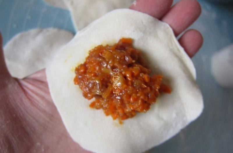 開水燙一半的面粉,另外的一半面粉用溫水和面混合在一起揉光。保鮮膜覆蓋松弛10分鐘。分成大小一樣的面胚,大小一樣的面胚,利於成品熟的時間一致。搟好的面皮不用太薄,包入適量的餡料。