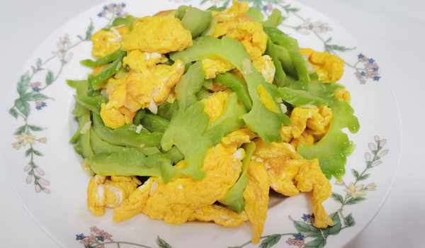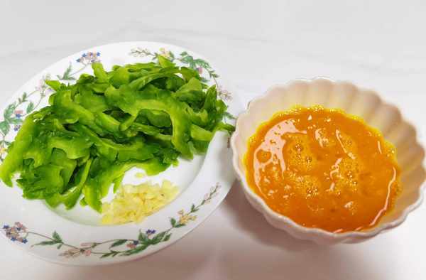 熱鍋熱油,倒入蛋液,煎成滑蛋,然後再倒入花生油,爆香蒜末,最後倒入苦瓜,放些蠔油,炒兩三分鐘即可出鍋