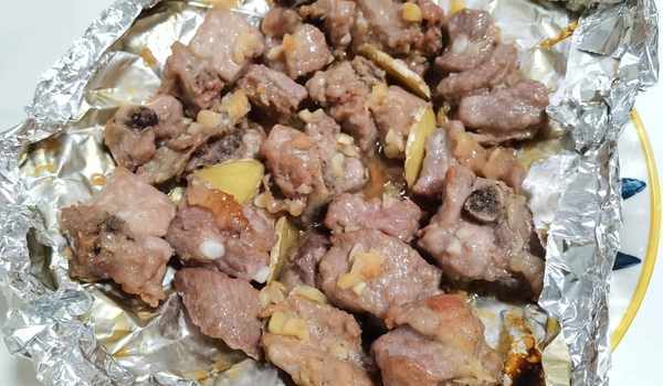排骨上面再鋪上一張錫箔紙,把四面的口封住,防止烤制過程中湯汁溢出