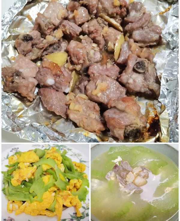今天菜式:蜜汁叉燒排骨,苦瓜炒蛋,瑤柱瘦肉咸蛋滾小冬瓜湯。