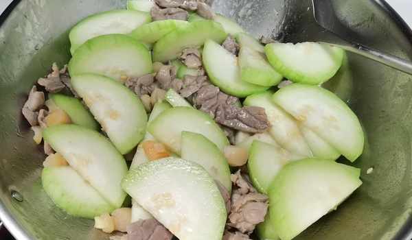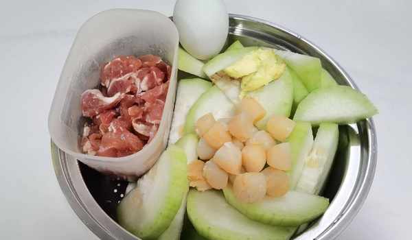 瑤柱先用水泡下,瘦肉切片用生抽,花生油入底味,咸蛋打開,把裡面的蛋黃弄碎,小冬瓜削皮切塊