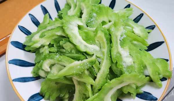 苦瓜切薄片,放少許鹽醃制出水份,去除苦澀味
