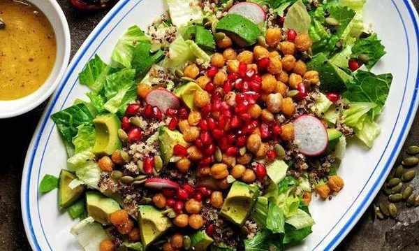食材:羅馬生菜、三色藜麥、熟鷹嘴豆、牛油果、切塊,並淋上檸檬)櫻桃蘿卜、(切薄片)石榴、(取籽)南瓜籽、橄欖油、鹽、現磨黑胡椒