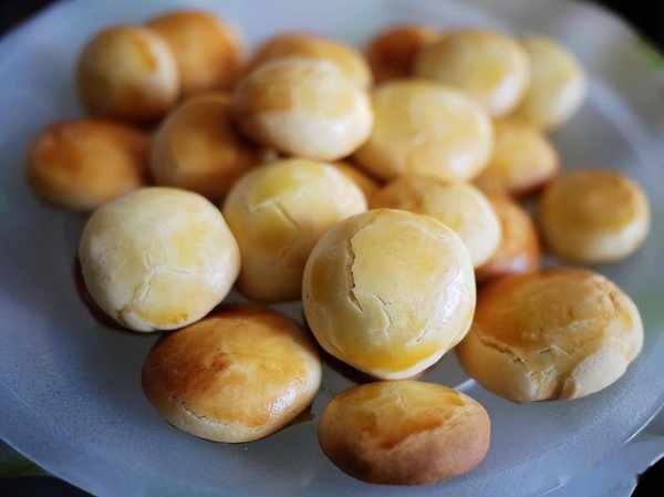 3、電餅鐺燒熱刷油,把一個個小圓形面餅放進去烙,直到兩面上色,鼓起小包,一道外酥裡軟的奶香小餅就做好瞭。