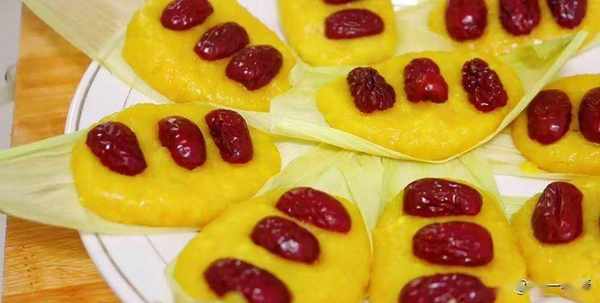 4.將泡軟的紅棗切成2半,取出醒發過的面團,揪下來一小塊兒,團成面團並壓扁,放在裁剪好的玉米葉上面,把3個紅棗壓緊在面團上;放入蒸鍋中蒸上20分鐘,黃金玉米餅就做好啦~