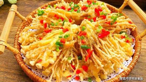 作法:金針菇清理幹凈後撕掉,青紅小米辣清理幹凈切碎預留。面粉裡加入生雞蛋、孜然粉、鹽、芝麻油和適量水調配成糊。金針菇裹面之後入5-6分熟溫度的鍋裡炸至兩面金黃,撈起來控油補水後擺入盤裡,再撒上切碎的青紅小米辣就可以。