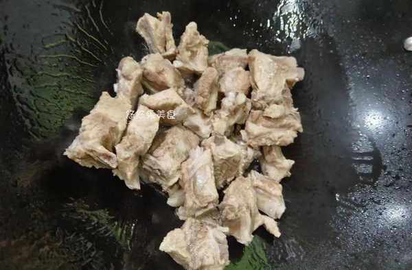 5.準備一個幹凈的鍋,鍋中的水分幹後,倒入適量的油,將洗凈後的排骨倒入鍋中,用鏟子將它們翻炒均勻。炒的過程中要勤翻動;