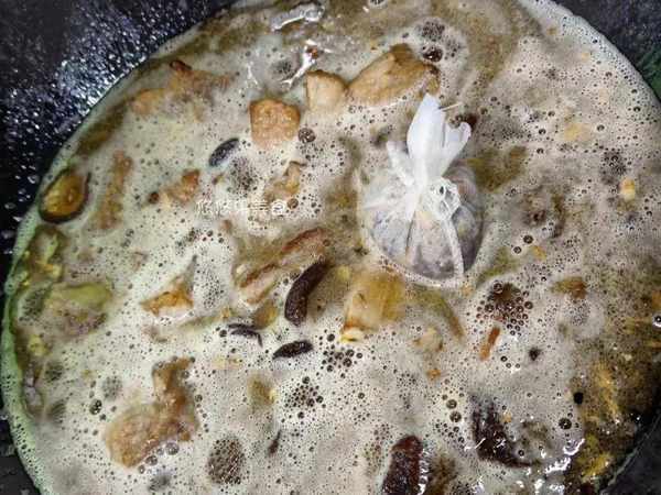 8.往裡面倒入一瓶啤酒,啤酒要超過食材。所以加入一瓶如果不夠,那就再加點,然後將鹵料包放在清水中洗凈。洗凈放入鍋中,隨後蓋上蓋子燜煮30分鐘;
