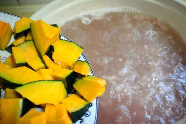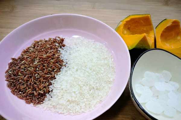 食材:紅米1大把、大米1大把、貝貝南瓜半個、冰糖適量。