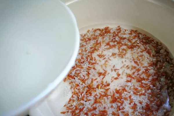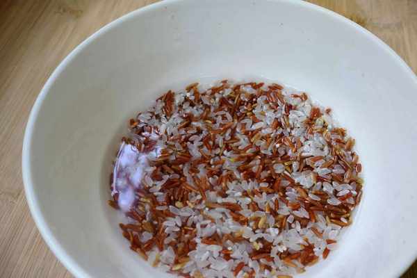 2、大米紅米洗淨,用少許水浸泡半小時,這樣容易煮黏稠,沒時間不泡也可以,只是煮的時間稍長。