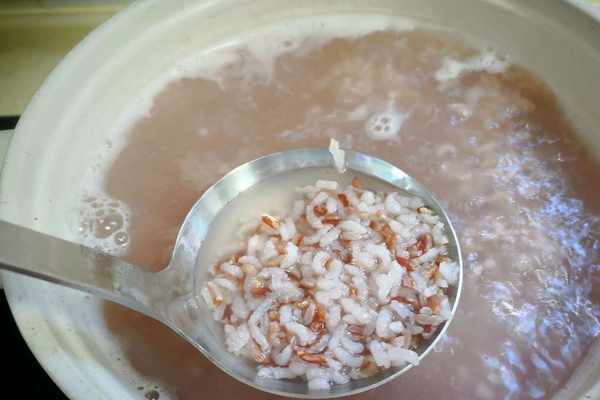 4、在鍋內放大米紅米然後加入適量的水,轉成小火熬煮。