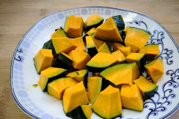 3、南瓜洗淨去掉瓜瓤,這種南瓜很嫩,瓜皮不用去掉,切成小塊待用。