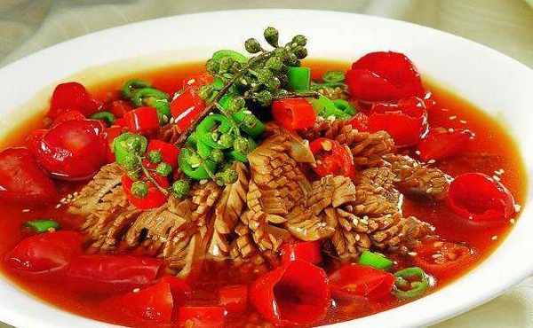 紅湯腰花:豬腰去筋膜,剖開去腰臊洗幹凈,斜刀將豬腰片成大張,厚約0.2厘米,然後用沸水燙制成熟。青筍經初加工後,切成菱形片,加入1克精鹽醃漬入味。將精鹽、味精、白糖、辣椒油、芝麻油、冷鮮湯放入碗中調勻成味汁。取一漂亮圓盤,先放入青筍墊底,再蓋上燙熟的腰片。食用時澆淋上味汁即可。這道菜爽滑可口,簡直讓人太滿足瞭!