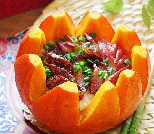 臘味合蒸金瓜煲:小南瓜在三分之一處切開,將剩餘三分之二南瓜中的南瓜籽和南瓜瓤掏凈,邊緣切出鋸齒形狀,臘腸、潤腸和臘肉用清水浸泡十幾分鐘、洗凈,臘味分別切片待用,南瓜煲中填入米飯,將臘腸、潤腸和臘肉分層鋪滿,填好內料的南瓜煲用保鮮膜覆蓋,放入微波爐高火10分鐘左右,就完成瞭,是顏值很高的一道菜。