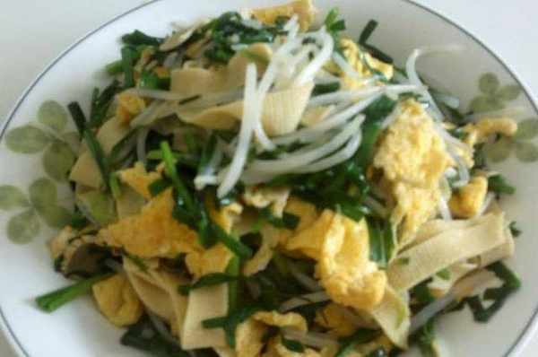 炒合菜:豆皮,豆芽洗凈,焯水。過遍涼水,控幹。雞蛋炒熟備用,韭菜洗凈,切斷。粉絲泡軟。鍋中放油,放入薑片煸炒放入豆皮,豆芽,蔥花,雞蛋,韭菜,鹽,生抽,粉絲,煸炒片刻。放入雞精出鍋即可。這道菜口味獨特,值得一試哦。