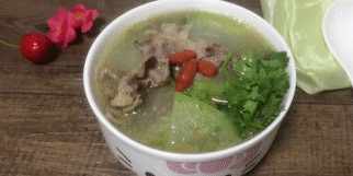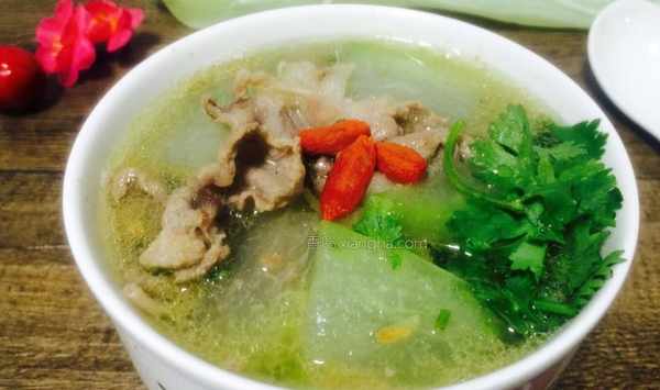 羊肉150克、冬瓜200克、鹽少許、油少許、雞精兩克、料酒一勺、葱適量、薑適量、香菜少許