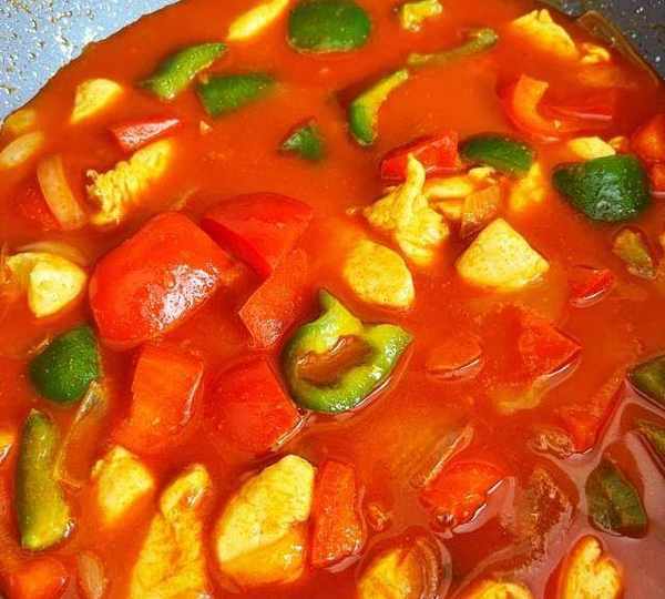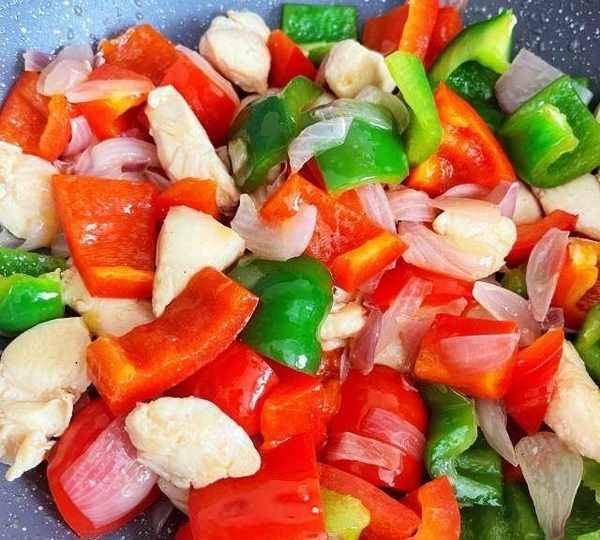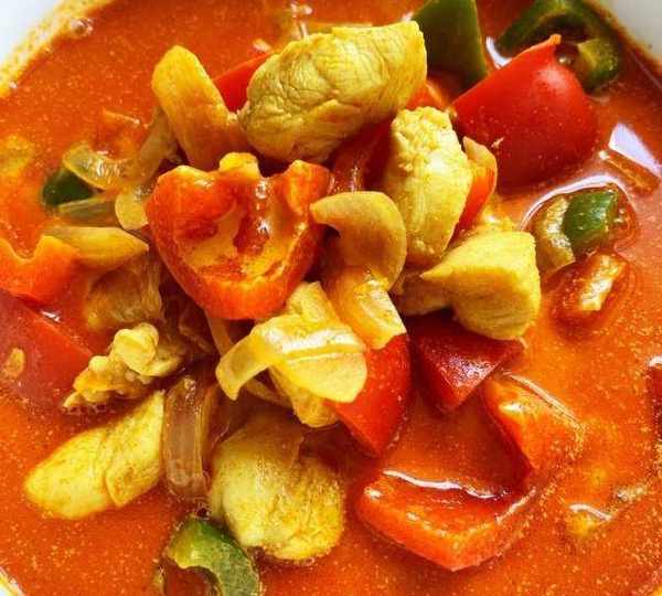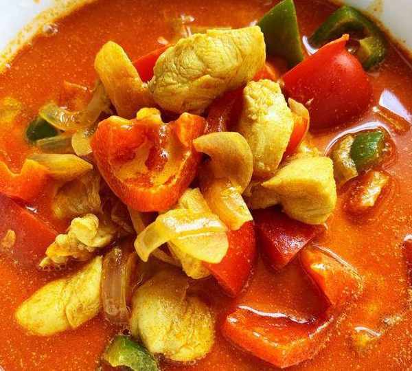 原料:雞柳、青椒、紅椒、小洋蔥、熱水、鹽、胡椒粉、芝麻油、咖喱粉、香菇精、鹽、椰漿、橄欖油。