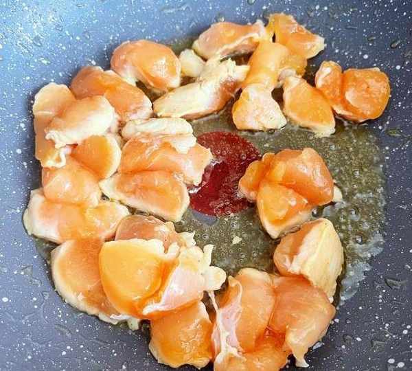 第7步、鍋內放一勺橄欖油,下入雞塊翻炒至變色。