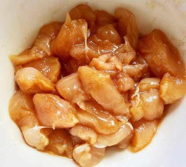 第1步、4條雞柳切塊,加入一丟丟鹽,胡椒粉,1匙芝麻油,拌勻醃制10分鐘。