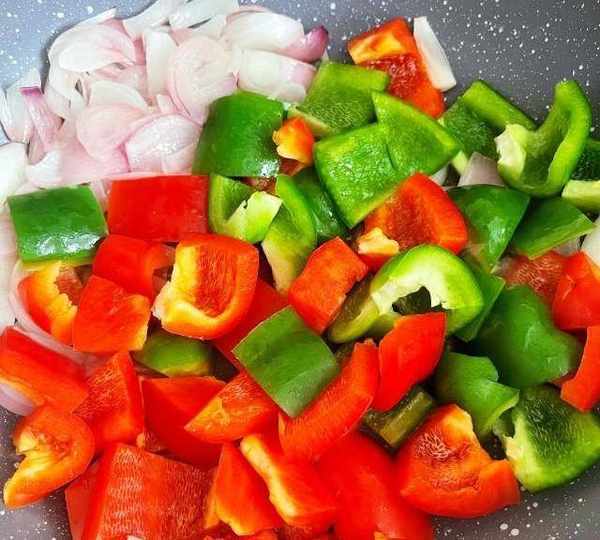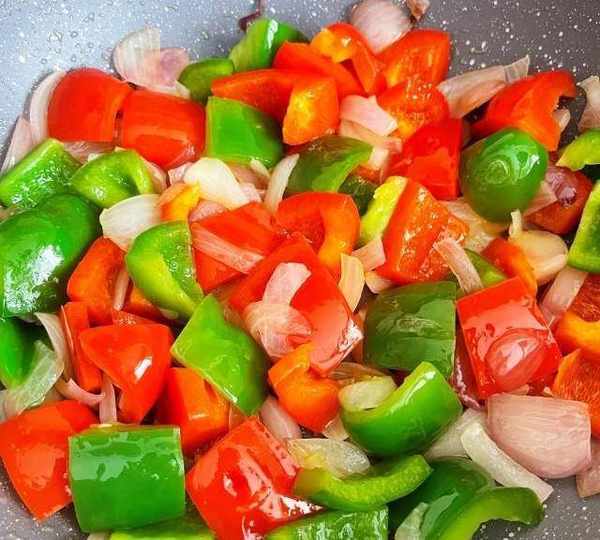 第6步、把洋蔥和青紅椒翻炒均勻一下,盛出來備用。