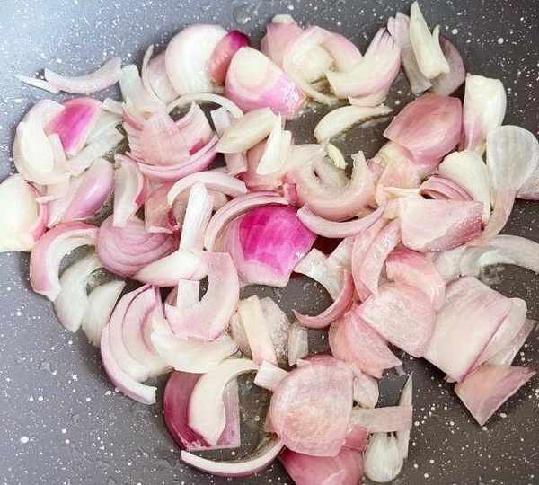 第4步、鍋內放一勺橄欖油,下洋蔥翻炒,炒出香味。