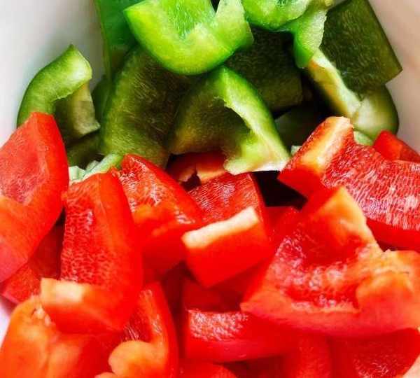 第2步、1個青椒,1個紅椒,去掉籽,切塊。