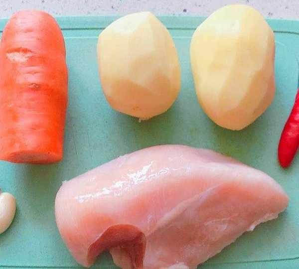 第1步、準備上圖食材,胡蘿卜土豆,雞脯肉,紅辣椒,薑蒜。