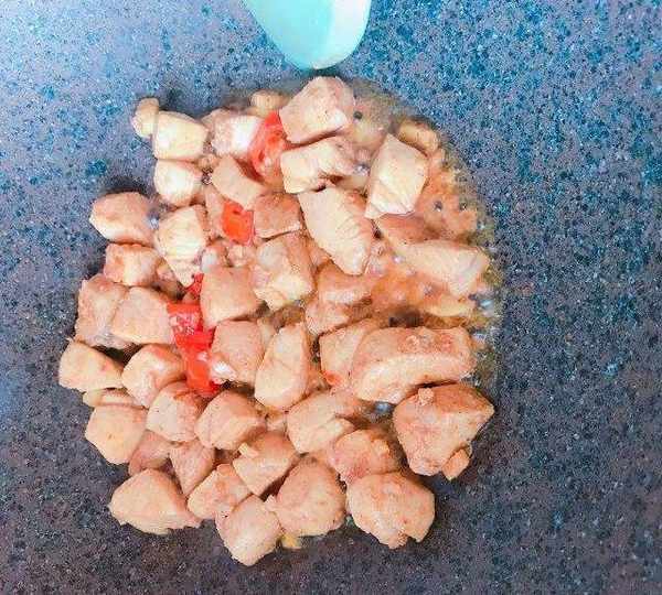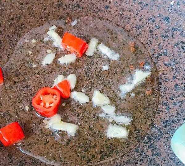第6步、油熱倒入大蒜末花椒紅椒爆香。