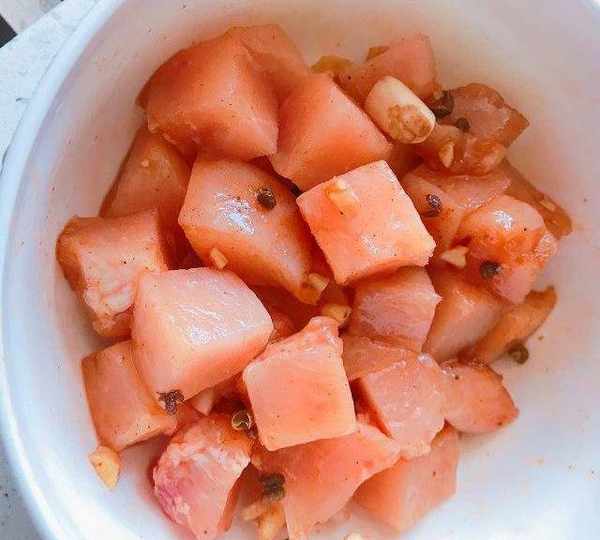 第4步、倒入料酒,醬油,薑蒜末,花椒醃制十分鐘左右。