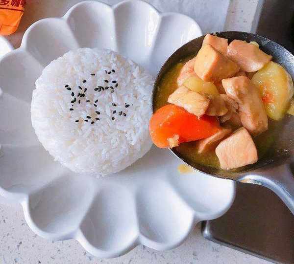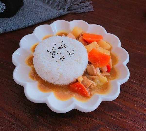 第15步、米飯用碗裝好倒扣,撒上一點黑芝麻,煮好的咖喱雞肉盛入盤中就可以吃啦!