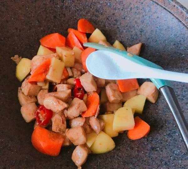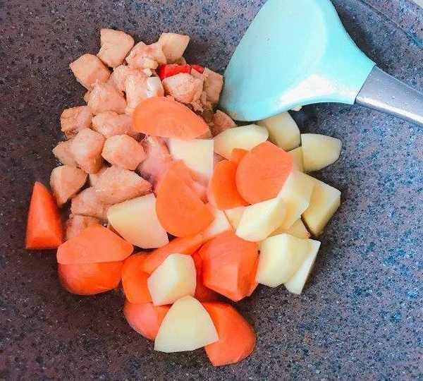 原料:雞脯肉、胡蘿卜、土豆、咖喱、紅辣椒、生薑、大蒜、食用油、開水、黑芝麻、醬油、料酒、花椒、鹽。
