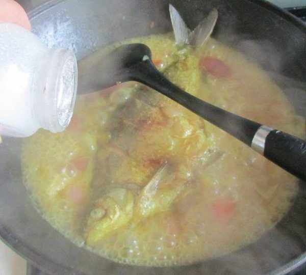 第11步、魚煮到八分熟時加入適量的鹽和胡椒粉調味,再大火收汁;