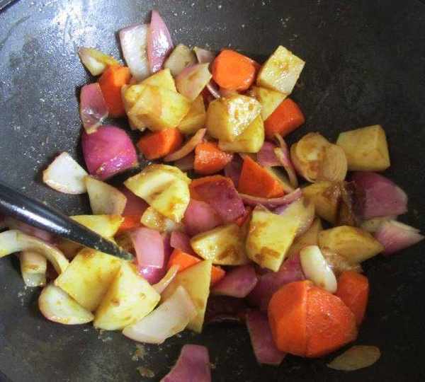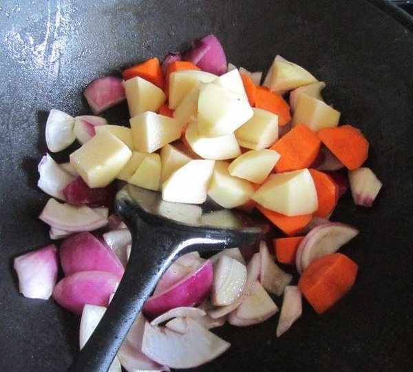 第7步、洋蔥煸炒至微微發軟後下入紅蘿卜和土豆塊,一起翻炒;