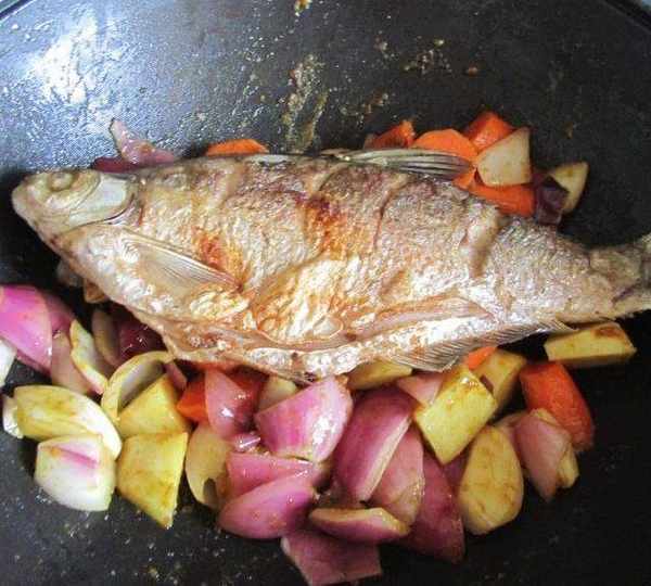 第9步、咖喱翻炒均勻後下入煎好的鯿魚;
