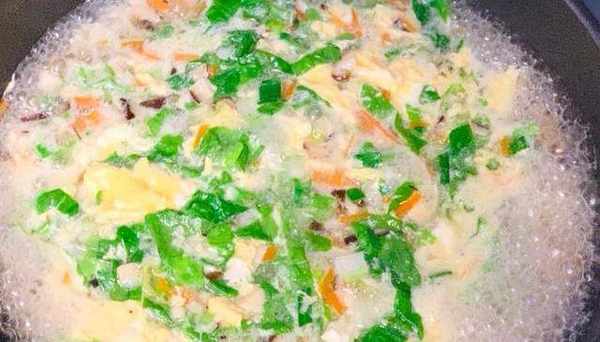 5、燒開後,把準備好的雞蛋液緩慢倒入,等雞蛋花起來後,再把青菜碎倒入鍋中。