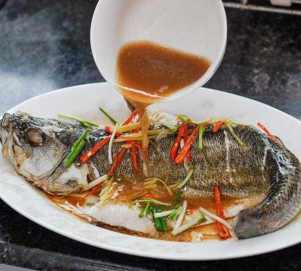 魚蒸好瞭,把盤中的魚湯倒出,再澆入前面準備好的豉油。把鍋燒幹加入少量油,油加熱後,淋在魚上,可以聽見“嗞嗞”的聲響。