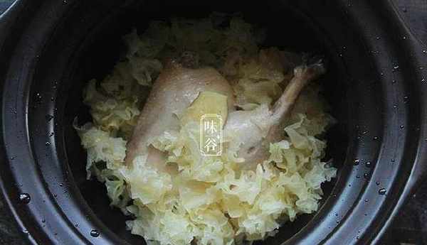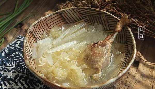 【材料】:銀耳半朵、鴨肉200克、白蘿卜半根、料酒1勺、薑3片、鹽適量