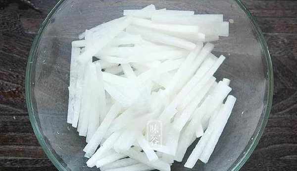 6、白蘿卜去皮切成條狀;