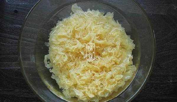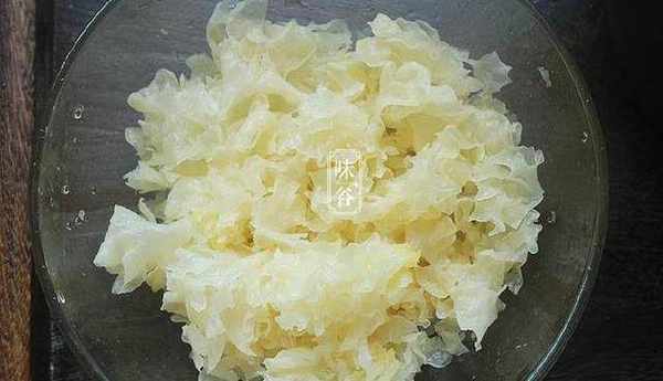 2、泡發後的銀耳去根,撕成一朵朵;