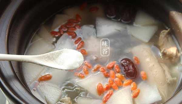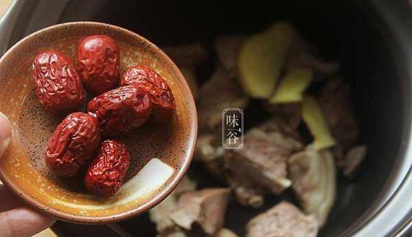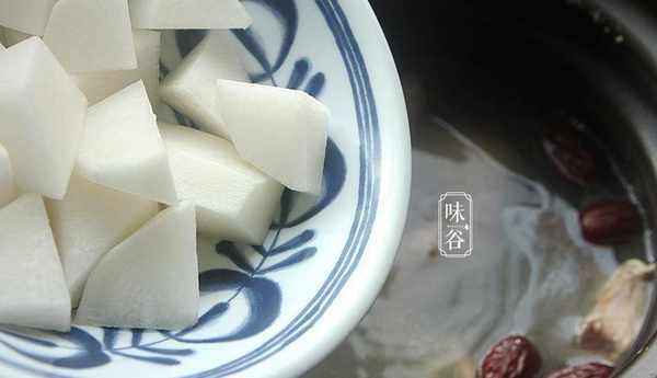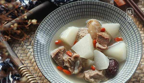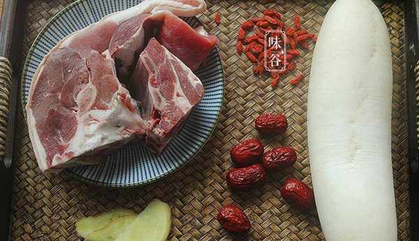 【材料】:白蘿卜 半根、羊肉 500克、紅棗 6顆、枸杞 1把、薑 4片、鹽適量、蔥 適量、