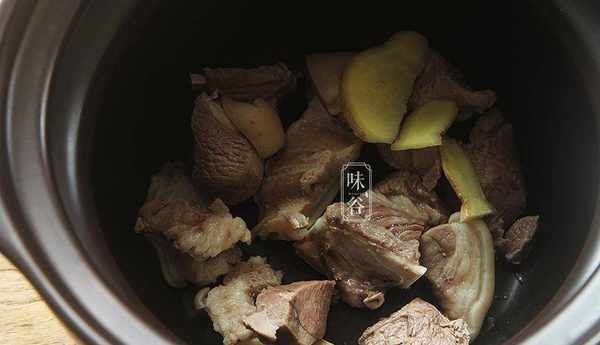3、焯水後的羊肉和薑片一起放進湯鍋裡;