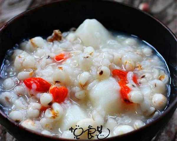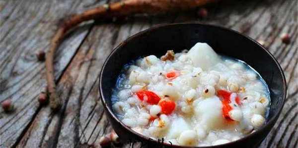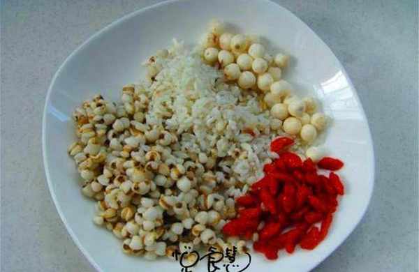 食材:鐵棍山藥300g,薏仁50g,芡實50g,大米100g,枸杞適量。