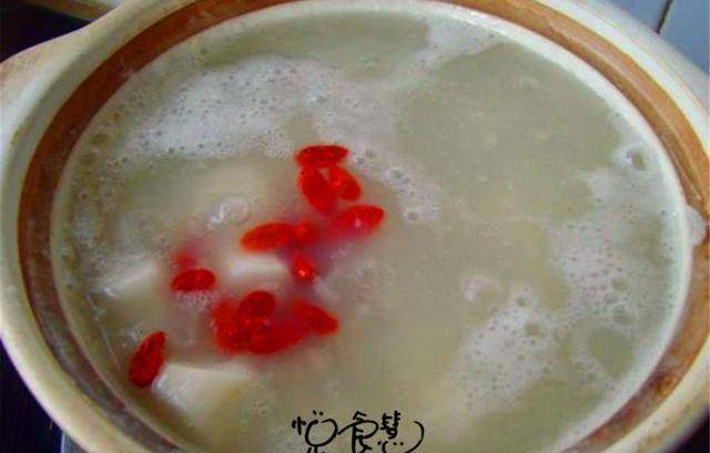 4,軟爛後再下入山藥塊和枸杞,山藥煮至軟爛後,大約10分鐘就可以關火瞭。滿滿一大鍋的”四寶粥”就做好瞭。