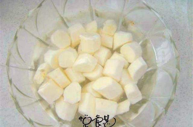 2,鐵棍山藥去皮,洗掉表面的黏液,用冷水浸泡,用冷水浸泡是為瞭防止山藥便面的大量淀粉迅速氧化變黑這樣就很影響美觀瞭。很多人不喜歡山藥是因為在處理完山藥之後感覺皮膚發癢,這裡教你一個小妙招可以嘗試一下,在處理完山藥之後迅速的用清水清洗手上黏液,感覺還癢就用醋洗一遍,山藥黏液的大量淀粉與醋酸堿中掉,這樣皮膚就不癢瞭。