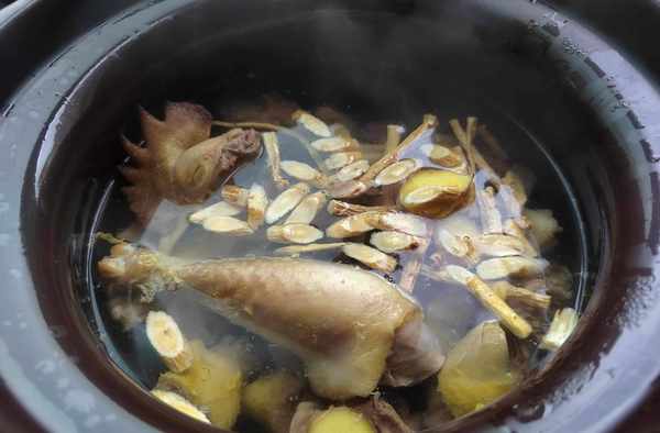 第三步:把雞肉放入砂鍋中,加入洗凈的黃芪、黨參和剩餘的薑片,倒入足夠的清水,中火燉60分鐘。