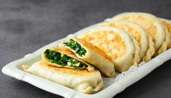 ⑤醒發好的面粉,搟成一個小圓,加入韭菜雞蛋餡料,封好口,加入平底鍋煎至兩面金黃即可出鍋。