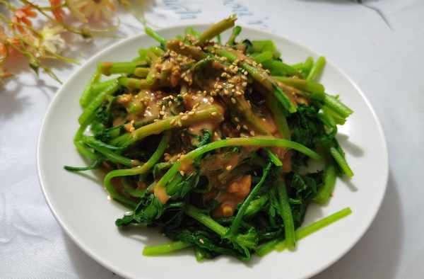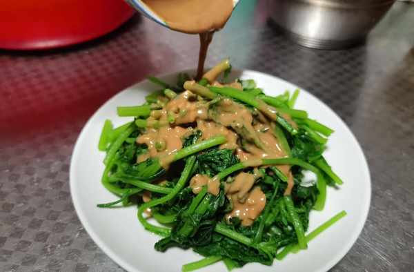 4.將調好的芝麻醬淋在蒿子稈上。芝麻醬調的過稠會糊嘴,影響口感;過稀,味道不容易裹住蒿子稈,會影響味道,所以麻醬的稀稠濃度一定要適中