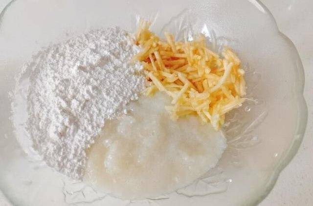 2、買來的蘋果洗幹凈削皮切成絲備用,把之前蒸好的山藥取出用搟面杖或其他工具壓成泥狀,再把切好的蘋果絲倒入進去,再加入適量普通面粉。