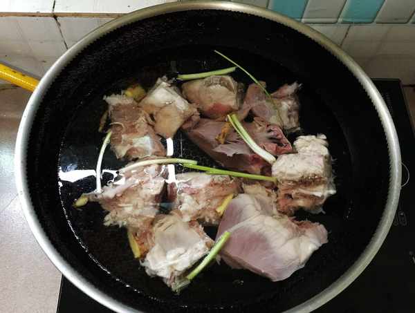 3:泡出血水的牛排骨,豬心,冷水下鍋,加香蔥,薑片,料酒,焯煮5分鐘。
